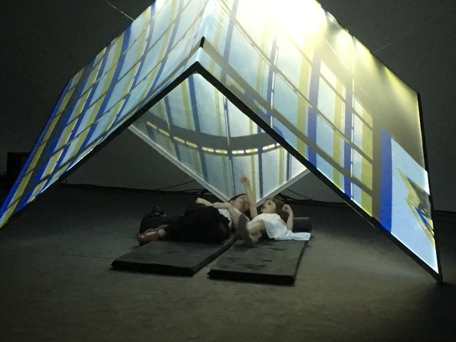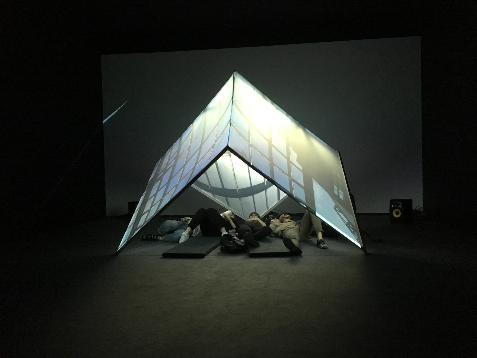 An audiovisual installation with a tent made of three back projection screens, three video projectors and one sound system. The visitors are invited to enter the tent and lay down and have a transcendent experience, while surrounded by projections and sound, sensations can trigger imagination, sub conscious and emotional insights.